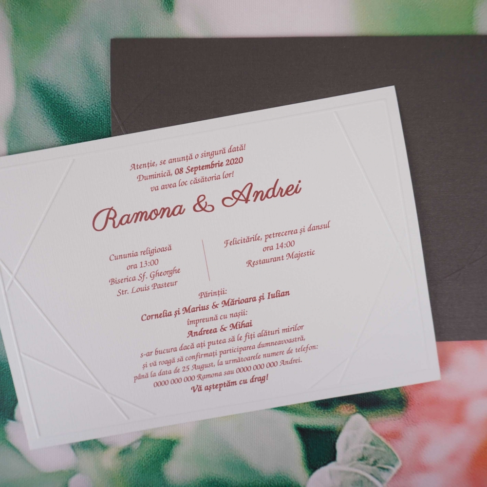 Invitatii de nunta confectionate dintr-un carton mat destinat textului cu model iesit in relief. Acesta se introduce intr-un plic. Invitatia se personalizeaza cu textul pe care il doriti, corespunzator evenimentului dvs.
