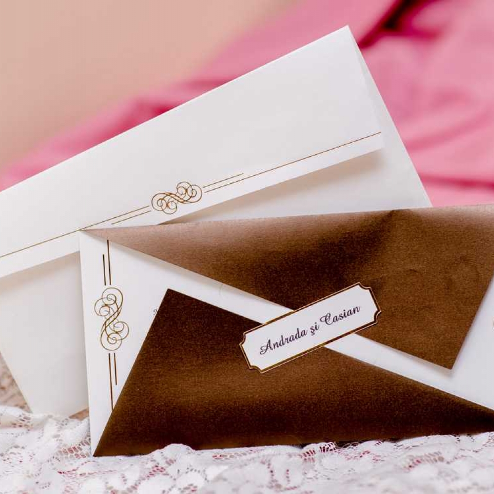 Invitatii de nunta confectionate dintr-un carton destinat textulu cu model auriu pe laterale si eticheta cu margini aurii pentru numele mirilor. De aceasta eticheta se prinde un carton pliat in doua pe orizontala si in doua pe diagonala. Plicul invitatiei pastreaza acelasi model si este inclus in pret.