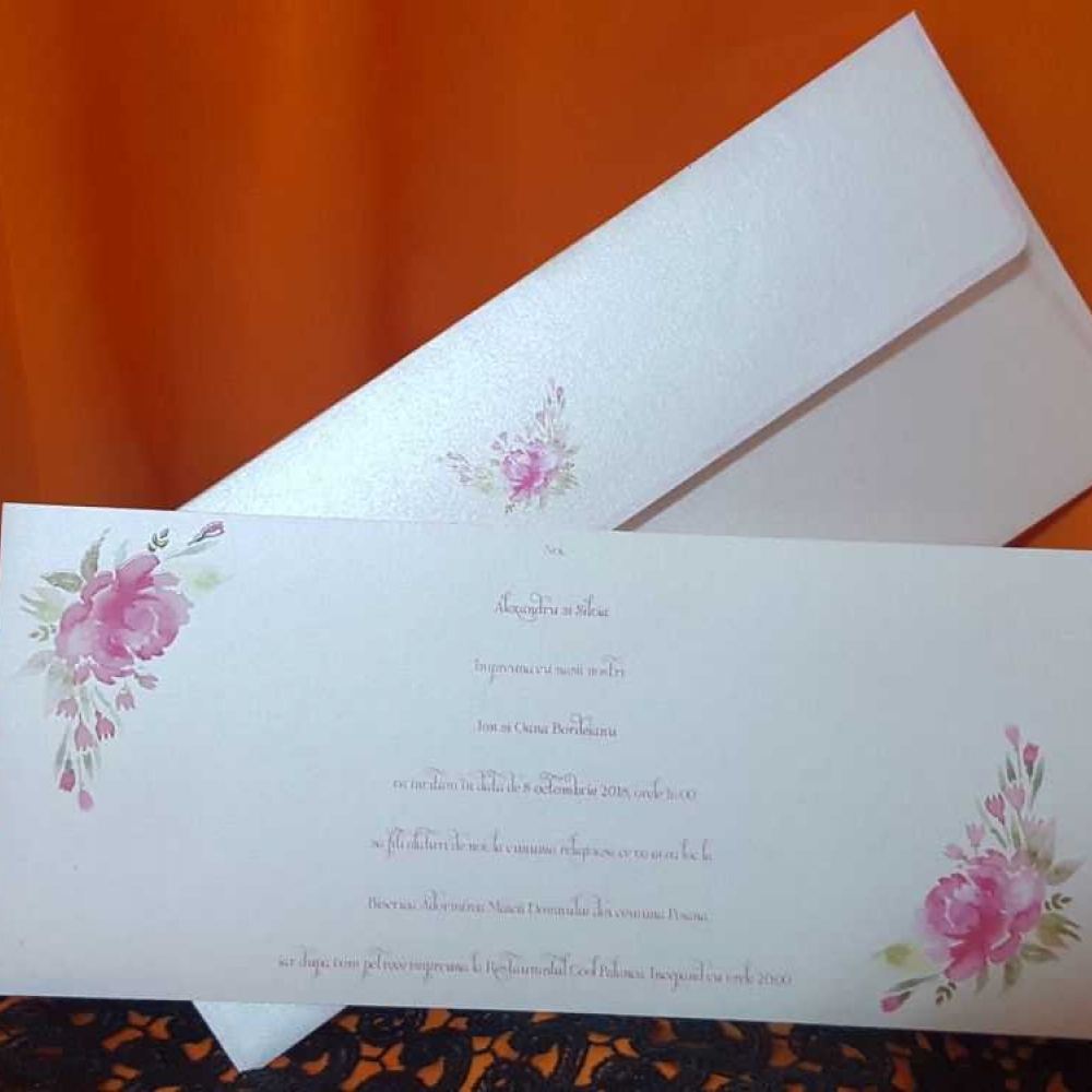 nvitatii de nunta confectionate dintr-un carton sidefat destinat textului, nu se pliaza si prezinta model floral in relief. Plicul invitatiei este inclus si pastreaza acelasi model.