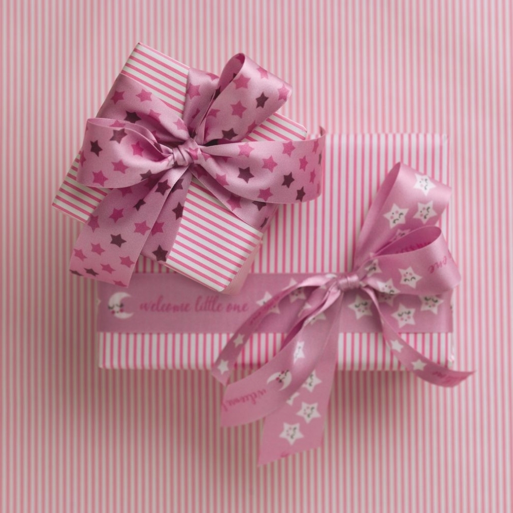 Panglica dubla din satin cu o tema pentru bebelusi cu stelute roz.