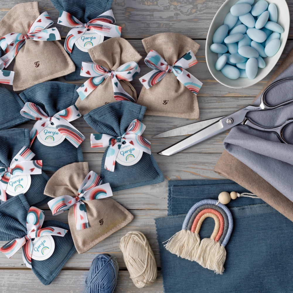 Panglica din bumbac imprimata cu curcubee, cu inimioare si nori, perfecta pentru cadourile pentru copii sau marturiile de la botez.