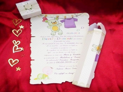 • Ne rugăm la Dumnezeu Pentru sufletul tău, Ca din mic tu să creşti mare Din plăpând să te faci tare, îngeraşul te-nsoţească De rele să te păzească. Sunt cel mai frumos dar pe care Dumnezeu l-a făcut părinţilor mei şi mă numesc , Dornică să vă cunosc, vă invit la prima mea petrecere pe care mama şi tata, . şi . . o dau în cinstea mea, în ziua de Duminică, 01 Ianuarie 2013, ora 02:00, la Restaurantul "." din .. Sărut mâna naşilor mei, . şi . .. Vă aşteptăm cu drag!