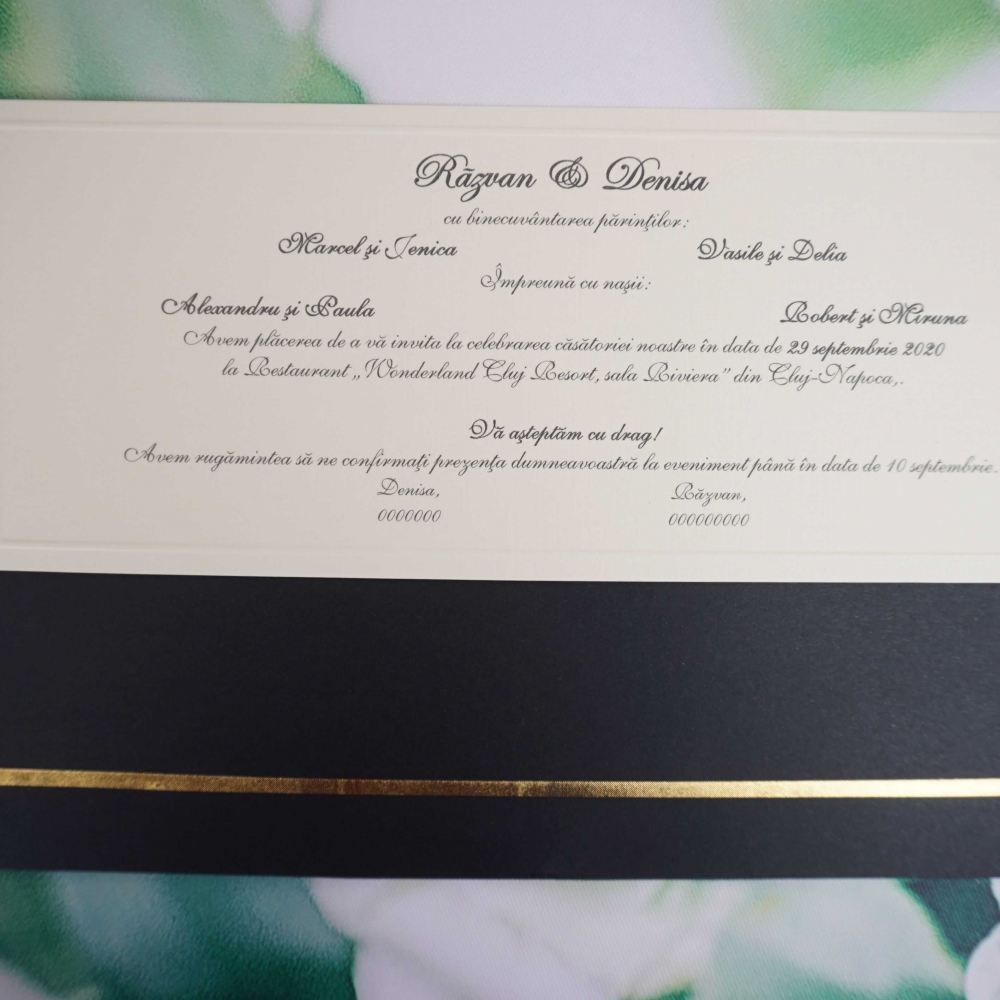 Invitatii de nunta confectionate dintr-un carton mat destinat textului, cu margini iesite in relief. Acesta se introduce intr-un plic. Invitatia se personalizeaza cu textul pe care il doriti, corespunzator evenimentului dvs.