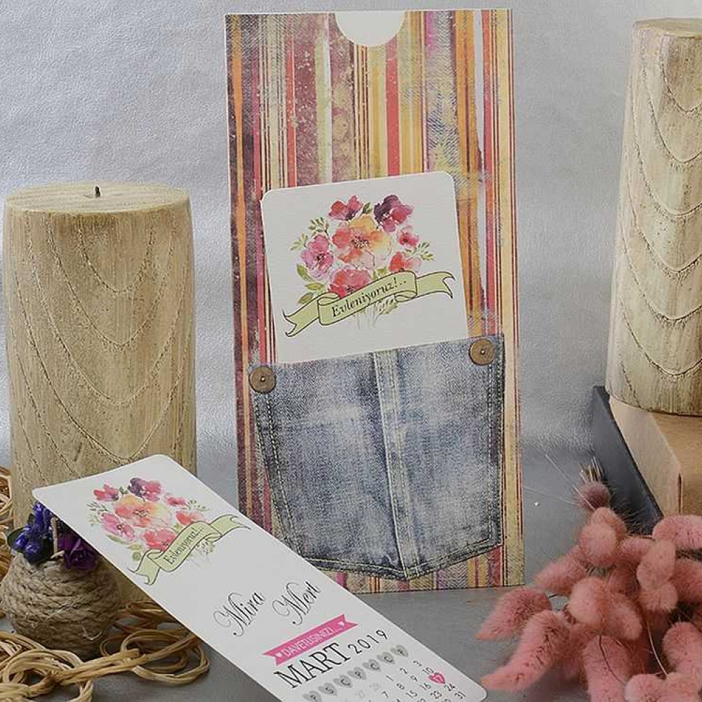 Invitatii de nunta moderne confectionate dintr-un carton mat destinat textului. Acesta se introduce intr-un plic accesorizat cu dungi vericale si un buzunar in care se introduce un alt carton de tiparire. Nu prezinta plic clasic.