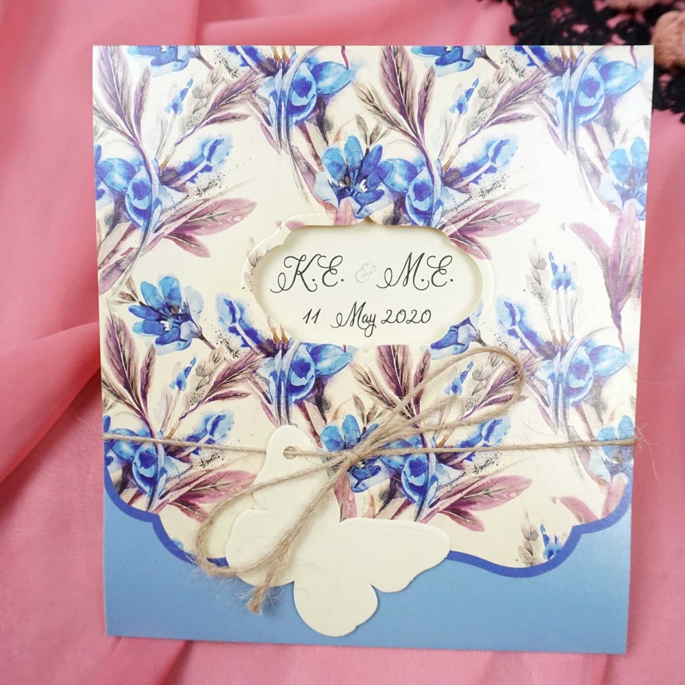 Invitatii de nunta confectionate dintr-un carton lucios destinat textului. Acesta se introduce intr-o piesa din carton care se pliaza in trei si se leaga cu o sfoara accesorizata cu o eticheta in forma de fluturasi destinata numelor invitatilor. Invitatia nu contine plic clasic.