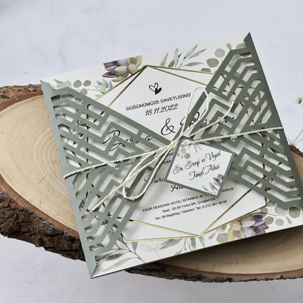 Invitatie printata pe un carton ivorie cu un print de nuanta verde. Invitatia vine impreuna cu un plic decupat de nuanta verde padure.